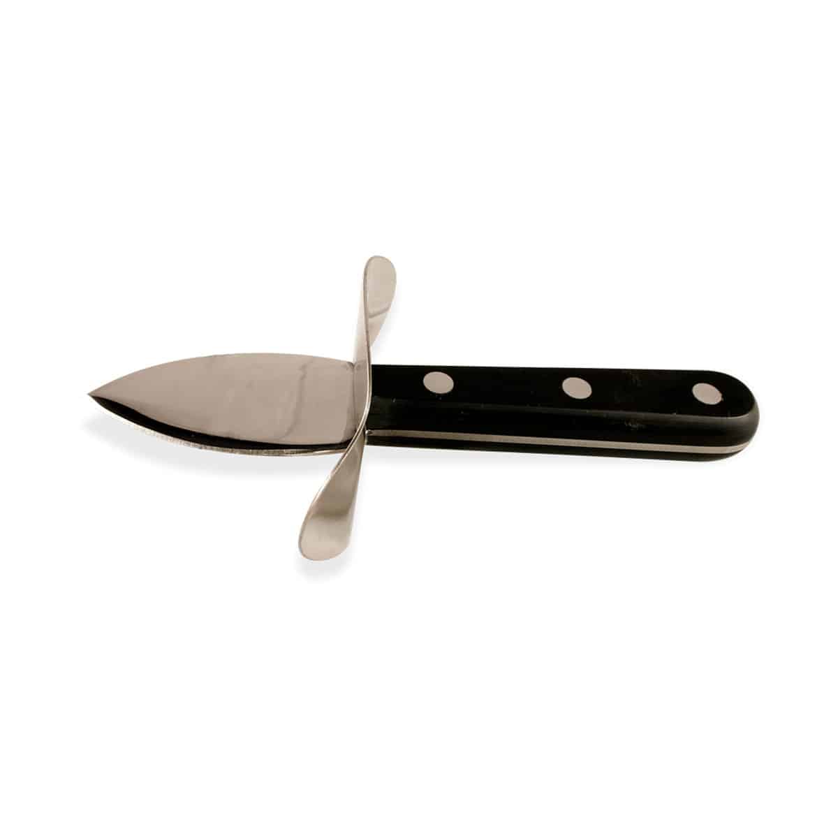 Cuchillo abridor de ostras con refuerzo de protección y hoja estrecha.