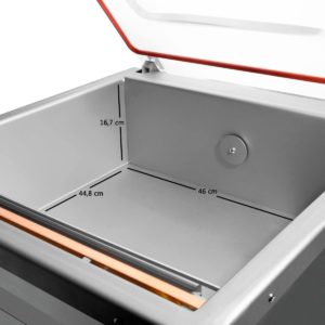 NUEVO MODELO D-45. Envasa bolsas de hasta 44 cm de ancho x 50 cm de largo. Toda INOX. Digital. Permite la realización de vacío en bolsas desde el exterior de la cámara.